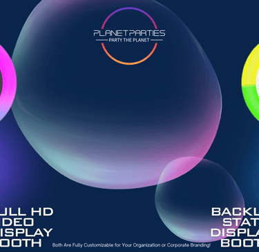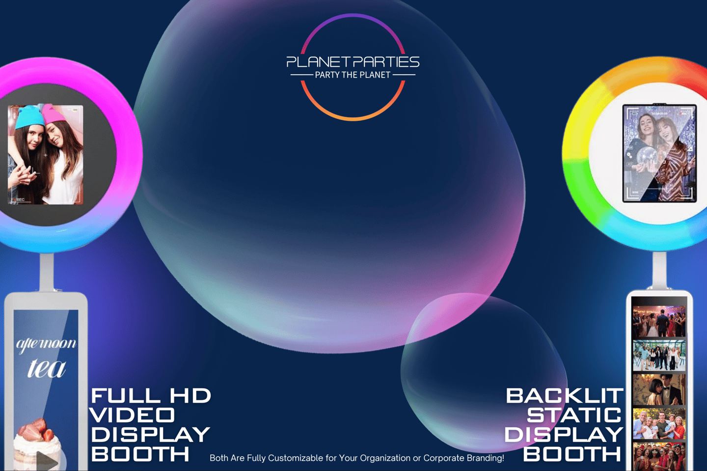Customized VIDEO PEDESTAL Booth with YOUR CUSTOM LOGO or Video presented on a with 39" High-Resolution Video Display!* (A Planet Parties Exclusive)
